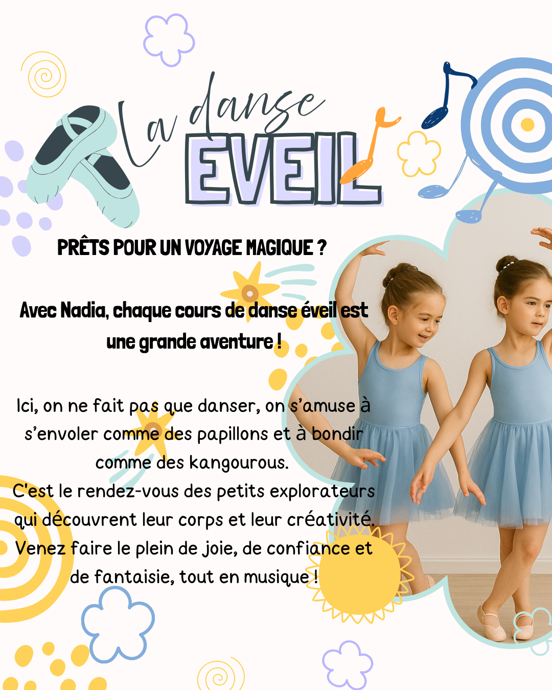 Un moment de joie et de créativité : La danse éveil est une parenthèse enchantée qui développe la musicalité, la coordination et la confiance en soi.